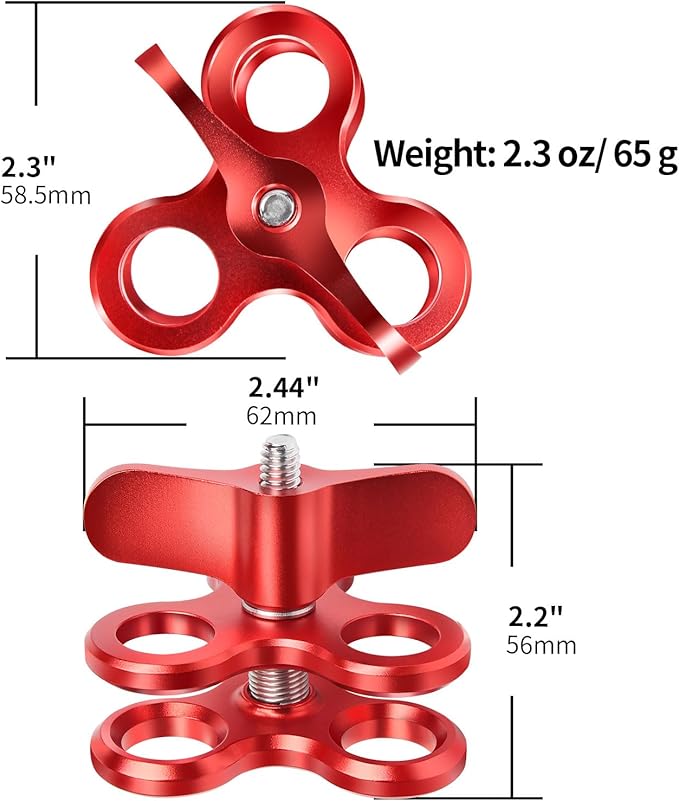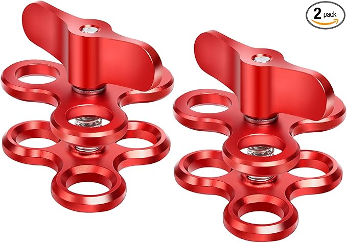 3-Hole 1" Aluminum Underwater Camera Clamp Ball Mount (2-Pack) - Underwater Bracket for Diving Light Arms & Camera Trays, Saltwater-Resistant Adapter for Scuba Photography/Videography Gear