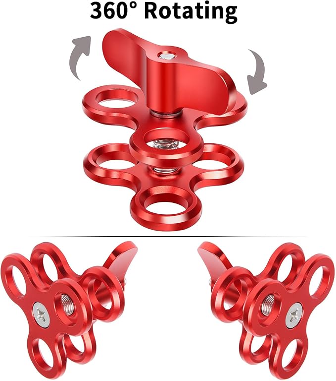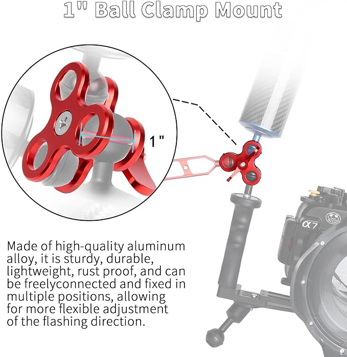- 【360° Rotation】The ball clamp mount allows for 360-degree rotation, making it easy to connect a fill light, flashlight, arm, float tube or action camera, providing a versatile underwater photography experience
