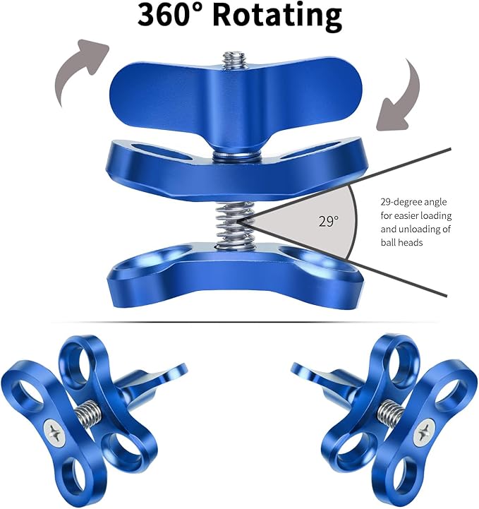 - 【Comfortable】The clamp opening is designed at an angle of 29 degrees, divers can freely and quickly use the clamp to easily clamp the ball head, the clamping adjustment angle range is wider
