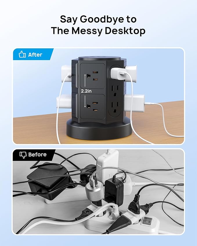 - 【2100 Joules Surge Protection】: This tower power strip surge protector is designed with your safety in mind. Built with 2100J surge protection, Limits voltage fluctuations during power surges or lightning strikes, safeguarding devices from harm. It also features a 1380℉ flame-retardant casing, circuit breaker switch, and protection against overload, short-circuit, over-current, over-voltage, and overheating. Ideal for home, office, or entertainment setups, it ensures the safety of your home and connected devices