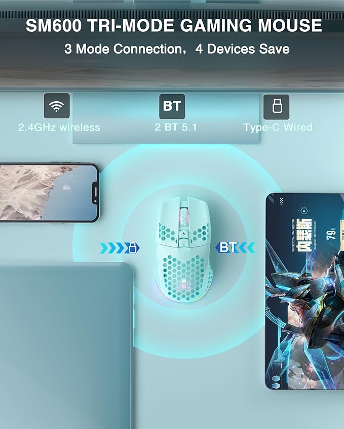 - 3 Mode connection:M600 PRO wireless gaming mouse adopts tri-mode connection,2.4G wireless,2 BT5.1,Type-C Wired connection.Users can save 4 devices same time,support PC,laptop,tablet,mobile phone,etc. Switch convenientand connection quick