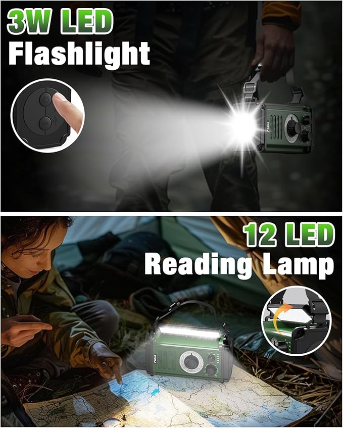 - [Powerful Lighting and SOS Alarm]: Equipped with a 3W super bright flashlight and an LED reading lamp, this hand crank emergency radio meets all your lighting needs. In case of emergency, simply press and hold the SOS button to trigger a loud alarm and flashing lights, quickly attracting attention and facilitating prompt assistance.
