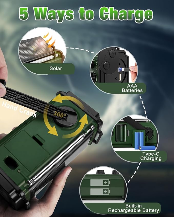 - [4 Charging Modes]: This emergency radio supports a variety of power options to ensure you stay connected. Charge quickly and efficiently via USB Type-C, or use alternative power sources such as the hand crank, solar panel, or AAA batteries (not included). With these 4 charging options, you can ensure that the radio remains operational in any emergency, keeping you connected with the outside world.