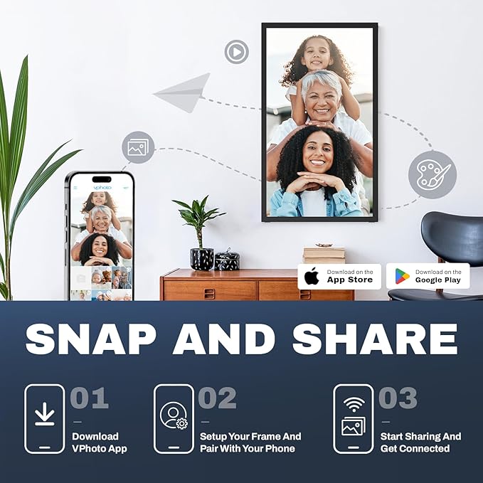 - 32GB Large Storage Space: You can share videos and photos to your frame securely and privately via VPhoto app and email from anywhere via WiFi, friends and family can enjoy your beautiful moments on the digital frame. The smart frame has 32GB of built-in memory to store up to 80,000 photos, and you can import and export images or videos. Supports Mirco SD card extended storage (up to 32GB, not included), giving massive storage capacity, you can store your fun times to your heart's content. Additionally, enjoy direct photo and video playback from USB flash drives and Mirco SD cards.
