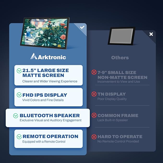 - Suitable for Any Scene: This multi-functional smart photo frame can provide you with a variety of choices to display family photos in the living room, delicious dishes in the kitchen, and company culture in the office. In addition, it can also be used for a variety of commercial purposes, such as displaying movie posters, corporate promotions, product displays, art exhibitions, trade shows, library and hotel decorations.