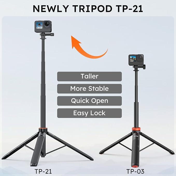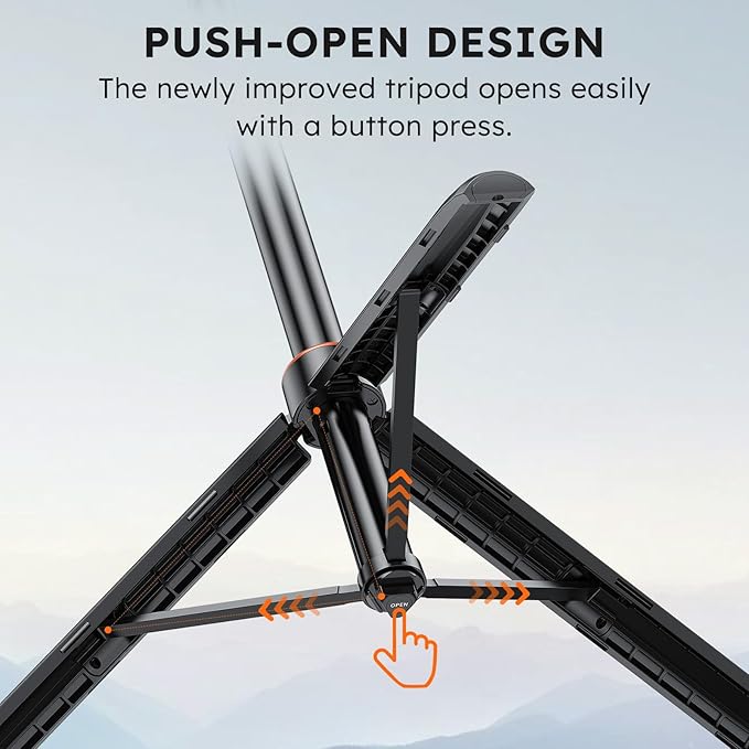 - 【Upgraded Stability for Any Terrain】Built with premium aluminum poles and skin-friendly ABS materials, this action camera tripod features non-slip rubber feet and an umbrella-inspired base design. It stays rock-solid on uneven surfaces like rocky trails or slippery slopes—ideal for adventure filming. Press-Open Designed,just press the bottom button to switch from selfie stick extension pole mode to tripod mode with one button.