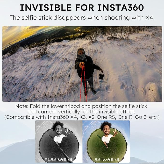 - 【Invisible Selfie Stick Effect】When paired with the Insta360 X4 series camera, its auto-editing feature magically removes the camera selfie stick from photos and videos. It can be maintained even in high-intensity action schemes, showing the incredible shooting angles