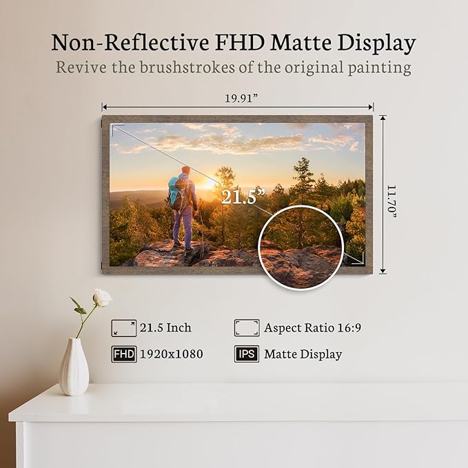 - 21.5 Inch FHD Matte Screen and Large Memory: BSIMB digital picture frame featured with 21.5 Inch 1920x1080 FHD IPS screen and an aspect ratio of 16:9, the digital frame displays stunning and clear images, which can revive the brushstrokes of the original painting. The digital photo frame built-in 32GB internal storage (holds 80,000+ pictures) with support for Micro SD Card (TF Card) and USB drive(Free bonus a USB drive). This digital picture frames also with a remote control making it perfect for older or less tech-savvy people to operate. NOTE:The battery type for this remote is AAA+, not included in the package.