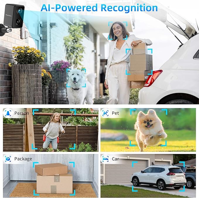• 【AI Powered & PIR Motion Sensor with Siren】The wireless security camera supports AI & PIR detection with siren that can recognize people, pets, packages or cars, which ensures accurate detection and fewer false alarms. Stay informed and react promptly to potential security threats, enhancing the overall safety of your surroundings.