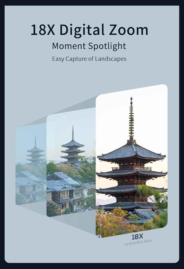 - 18X digital zoom, focuses on capturing exciting moments, allowing you to effortlessly shoot distant or nearby landscapes and easily bring beautiful scenes closer. The 270°flip-rotating 3.0 IPS screen makes photography a breeze, with simple operation and higher efficiency.
