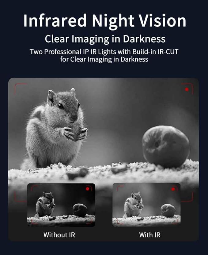 - High-definition infrared night vision for clear imaging in the dark, equipped with two IR night vision lamps, combined with the built-in IR-CUT, it can clearly capture the invisible world at night to the human eye.