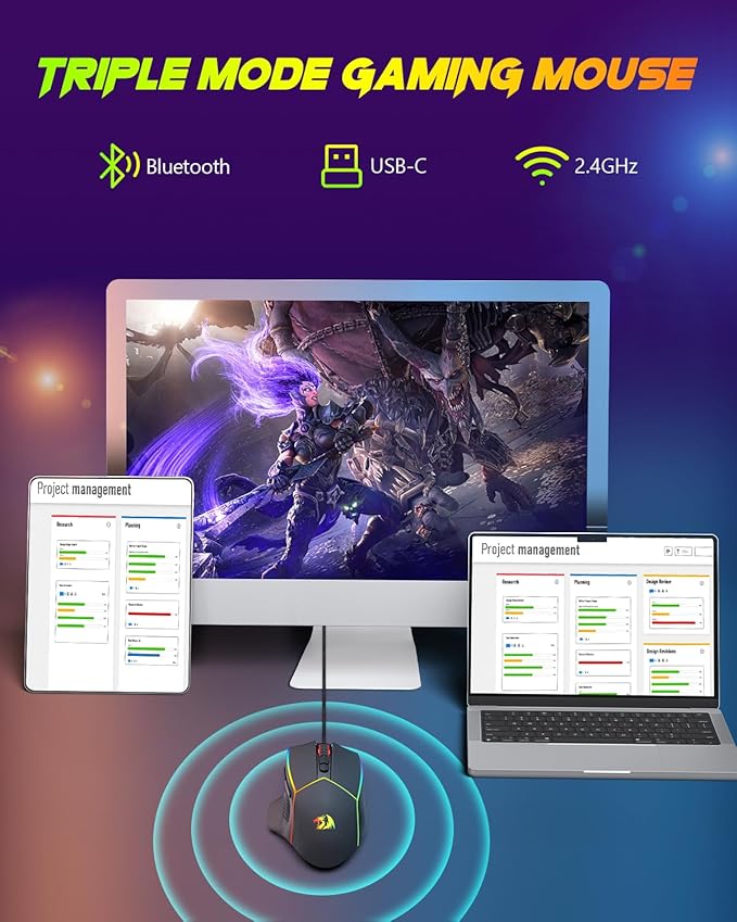 - 【3 Modes Connectivity】M814 wireless gaming mouse adopts BT/2.4G/Wired connectivity, make it easy to switch between different devices or different systems, such as laptop, PC, IPad,tablet, Meeting different user needs for gaming or working.