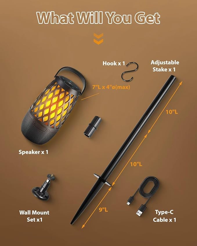 - Amazing 3 Modes Flame Light-Portable outdoor bluetooth speaker with lights have 3 light models, flickering flame light, breathing candle light, and solid amber light. The portable speakers can work as an independent LED atmosphere lamp, patio light, or portable lantern. Including a set of hook, ground stake, and wall mount, which is convenient placement for home and outdoor.