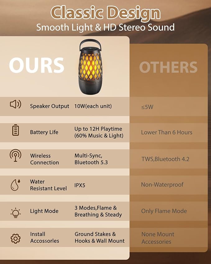 - Outdoor IPX5 Waterproof Design-With its IPX5 water-resistant, this outdoor waterproof bluetooth speaker can survive water splashes, spills, and light rain, so it is safe for outside use, such as by the pool or beach. You can also enjoy loud crisp clear music and warm flame atmosphere light with the wireless outdoor bluetooth speakers. With a single charge, you can enjoy clear room-filling sound and beautiful lighting effects for hours.