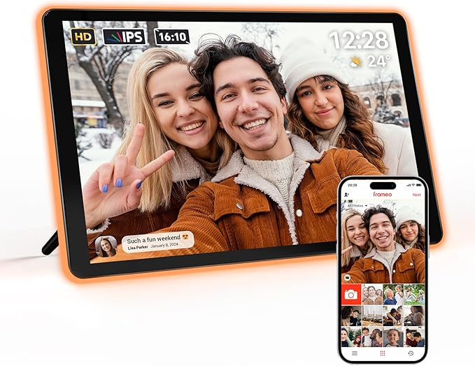 - [Experience Stunning Visuals]: Step into a world of vibrant detail and crystal-clear images with the Apolosign Neon Light digital photo frame. Featuring a 16:10 aspect ratio and a 1280x800 Full HD 2.5D glass touch screen, this frame delivers exceptional clarity and immersive depth. The advanced 2.5D glass lamination ensures that every photo you display comes to life with enhanced brightness and vivid detail.