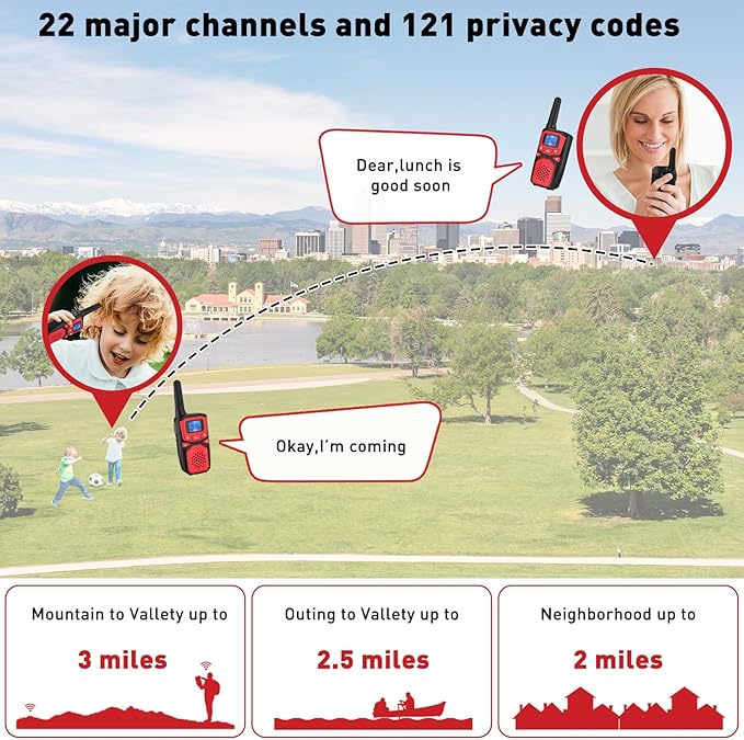 - 【Keep Children in Touch Even Without a Moblie Phone】: 2 way radios suitable for indoor and outdoor communication long range, with maximum range and clear sound up to 3 miles, good communication helper for upstairs, downstairs, yard, tour, mall, outdoor activities.no more screaming for the kids to eat.