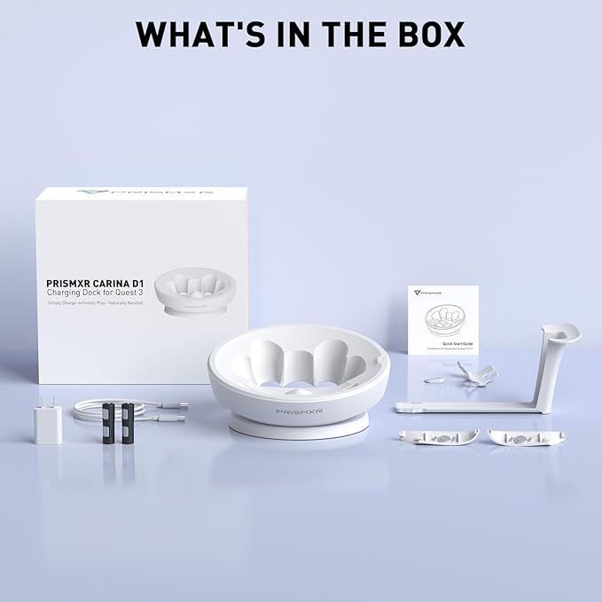- Ease of Use: Easy to set up, even when equipped with a battery strap, charges seamlessly (The battery strap can't be charged by Carina D1). When take off Quest3 and place it on PRISMXR Charging dock, it'll be fully charged to 100% and ready for your next adventure.experience.