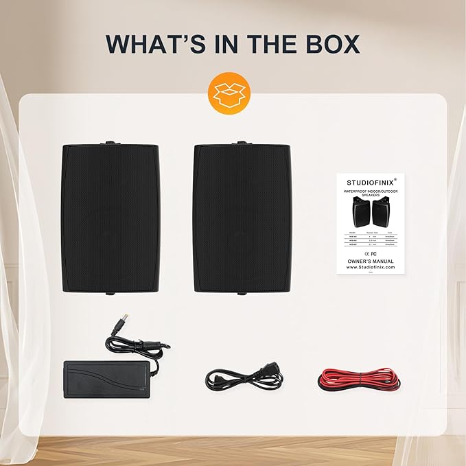 - 【What’s in the box& Dimension】:1 Active+ 1 Passive Speaker. 1 X 24V3A-US Power Adapter.1 X 12VDC-PWRCB.1 X Speakers Cables(5 Meters).1X Owner's Manual.Dimension:L:11.81"(30cm) x W:8.27"(21cm) x H:6.69"(17cm)