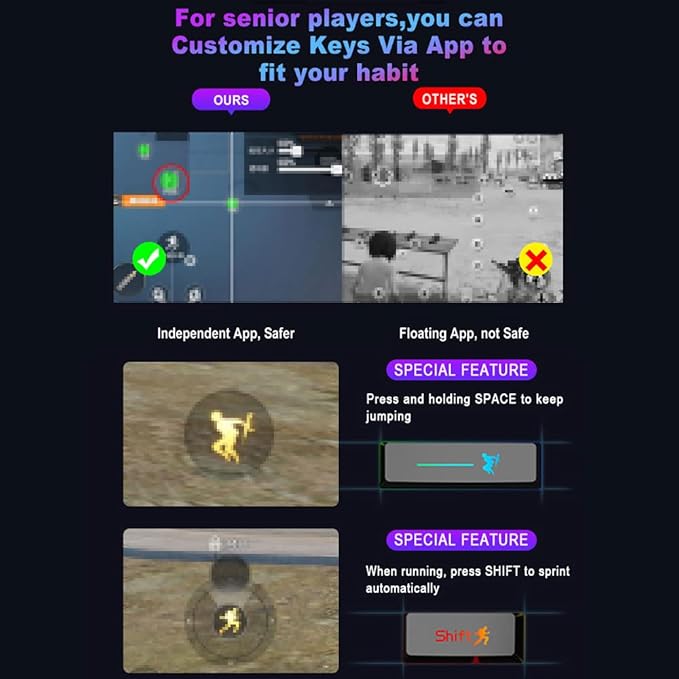 - š®ćCustomizable Shortcut Keys - One Step Aheadć- For all kinds of gamers, changing and familiarizing yourself with the configuration of buttons is the first step to victory. Therefore, this keyboard and mouse combination has built-in shortcut customization, supports customizing buttons attached to the APP to suit your button habits, and supports one-button continuous shooting.