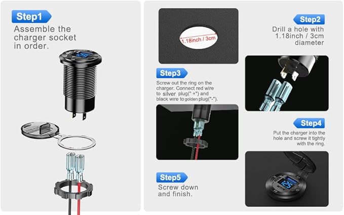 - Easy installation: You can replace your car's original cigarette lighter socket with this USB charger. Or, you can DIY the installation by drilling a 1.18 inch/3cm hole, inserting the charger and tightening the ring, then connecting the positive and negative wires(Red wire to Silver plug(+), Black wire to Golden plug(-) ). See the pictures for detailed installation instructions.