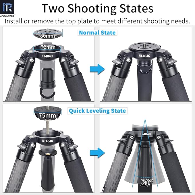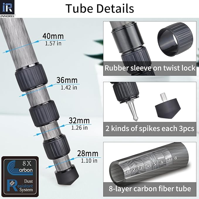 - 【SUPER QUALITY】Its max leg tube diameter is 1.57in/40mm and minimum is 1.10in/28mm, which is much larger than most tripods/monopods. Made of carbon fiber to maximize the legs strength to weight ratio of NT404C tripod, max load is up to 66lb/30kg.