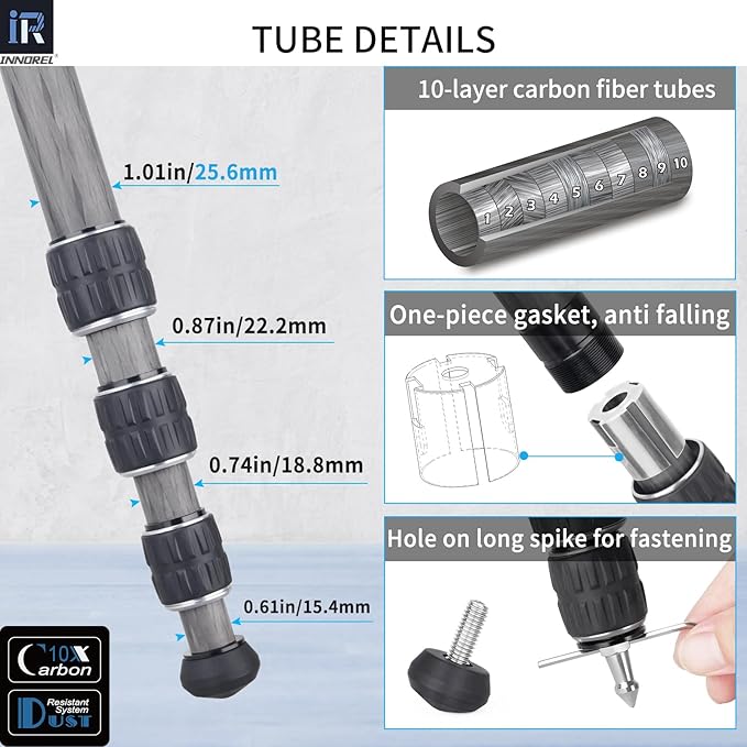 - 【RELIABLE QUALITY & PORTABLE】Made of genuine 10 layers carbon fiber, the tubes are lighter and stronger. The structure of this tripod is very compact, the folded length is only 19.7in/50cm so it is easy to carry and suitable for travel.
