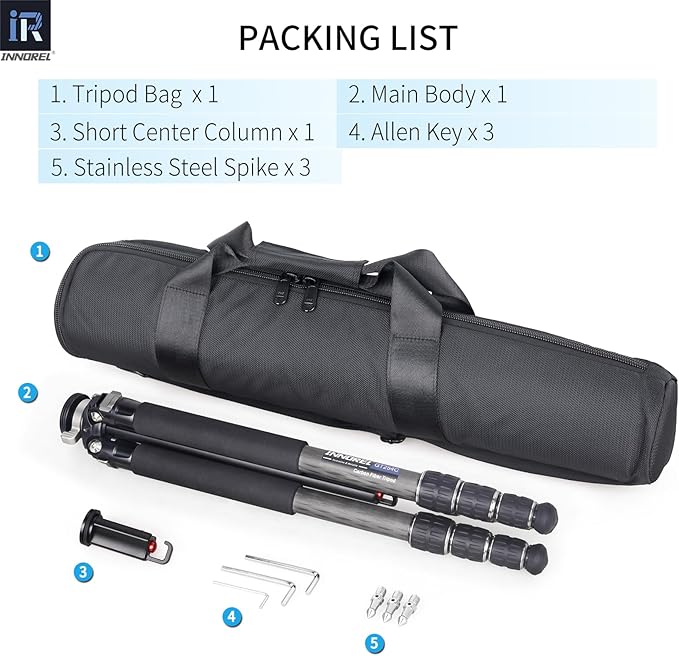 - 【PACKAGE】There is a tripod bag, a GT254C tripod, a short center column, three allen keys and three stainless steel spikes in the package.