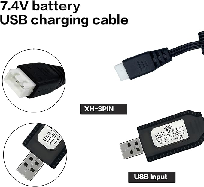 - This LiPo battery USB charger is specifically designed for 7.4V LiPo batteries and comes equipped with an XH-3 PIN PLUG. Before use, please ensure that the voltage (7.4V) is compatible. The input is DC 5V 0.5-2A, output is 7.4V 1000mAh, connector is USB to XH-3 PIN Plug