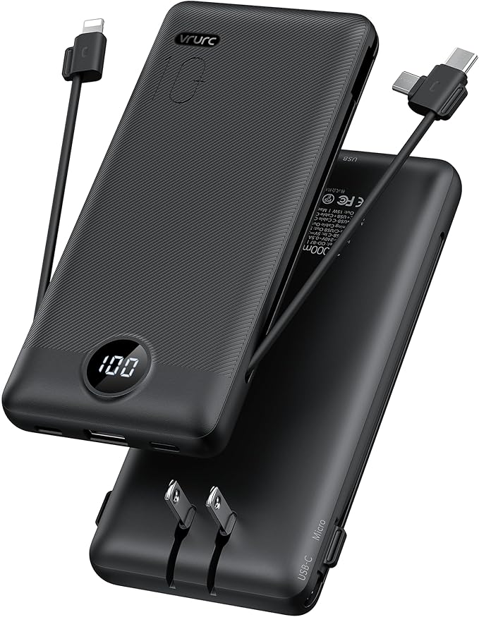 Portable Charger,Power Bank Built-in Cables and AC Wall Plug,VRURC USB C Portable Bank 10000mAh,Travel Essentials Phone Charger Compact Lightweight External Battery Pack for Smart Phones,Tablets-Black