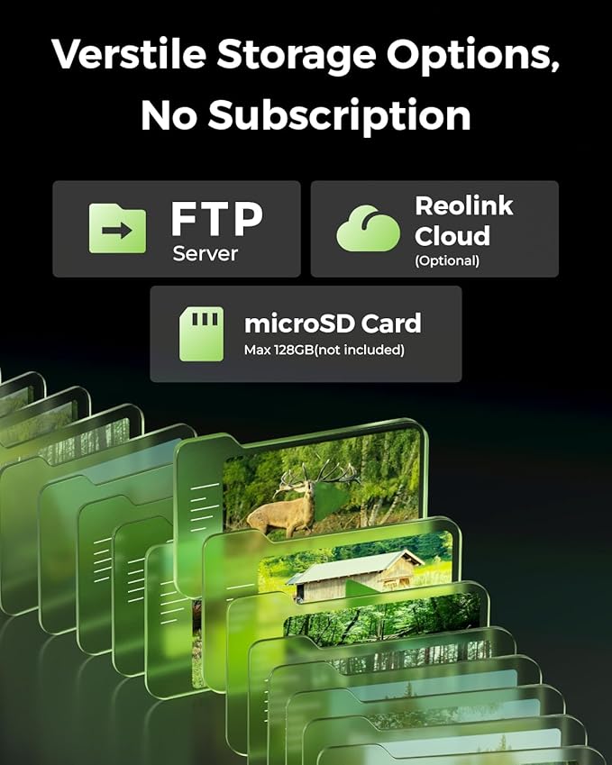 - MULTIPLE SIM CARD CARRIERS & STORAGE OPTIONS: Included Reolink SIM Card supports the carriers in the US: AT&T and T-Mobile, and can select carriers with the strongest signal automatically. Also, enjoy flexibility in storing recordings with options like microSD card and FTP server, download pictures and videos, no additional subscription fees.