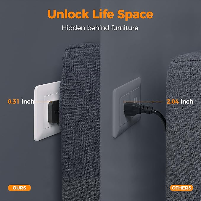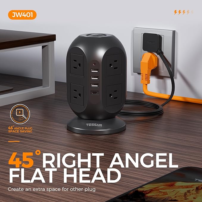 - Flat Extension Cord 10ft: With only 0.31 in ultra thin flat head design, power tower with usb ports can easily fit in tight spots and hide behind sofa, bed, nightstand or other furniture, sitting flush against the wall; 45 degree right angle design create an extra space for other plug below without blocking