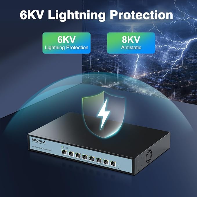 - 【Robust 6KV Lightning Protection】The 10gbe network switch built with a sturdy metal casing and featuring 6KV lightning protection, and tailored for harsh environments, delivering long-lasting reliability for your network.