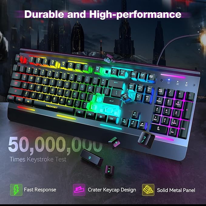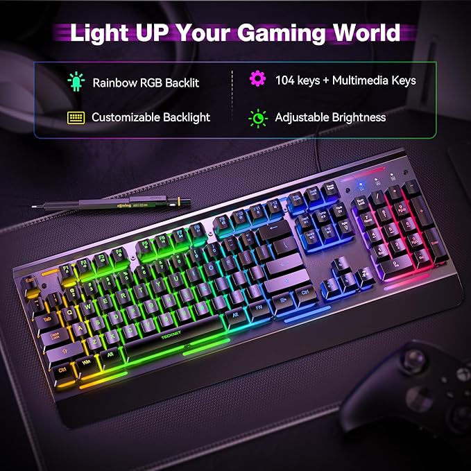 TECKNET Gaming Keyboard, USB Wired Computer Keyboard, 15-Zone RGB Illumination, IP32 Water Resistance, 25 Anti-ghosting Keys, All-Metal Panel (Whisper Quiet Gaming Switch)
