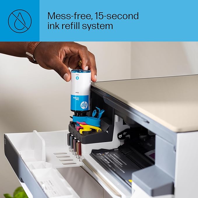 - MESS-FREE REFILL – Replenish ink with HP's easy-access, mess-free refill system. Simply plug the ink bottles into the ink tank and let them drain—no squeezing, no spilling