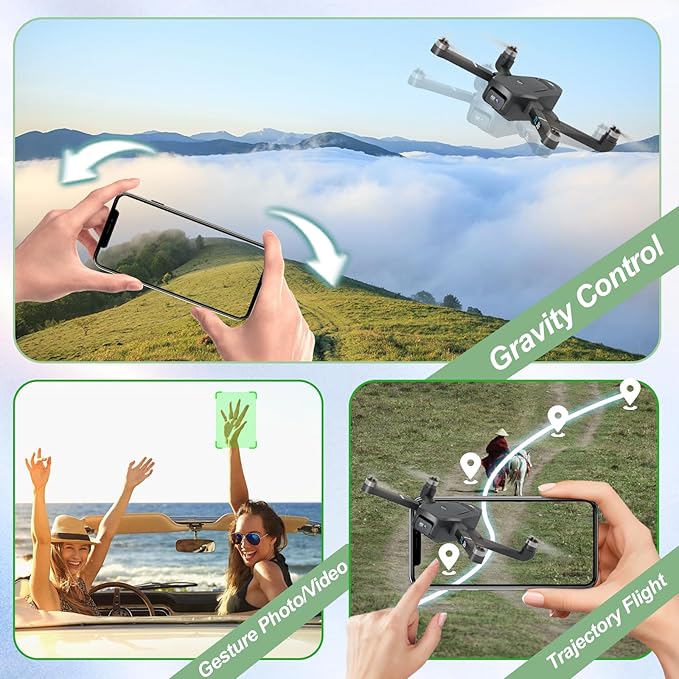 - More Flight Functions and Drone APP Control: Drone with camera for adult, controlled by the mobile app, provides a unique remote control flight experience. The 360° Flip function allows you to show the stunt performances of ace pilots in flight, making your flight experience more exciting . Trajectory flight function: Just draw the flight route you want to customize on the APP screen, and the drone will fly intelligently according to the set route.Fly as you like. Gravity control function: Just gently swing the phone, the drone can follow the direction of the phone to fly. Increase the fun of flying
