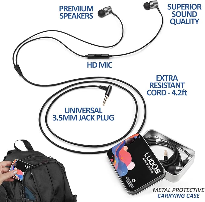 - LUDOS HEADPHONES WIRED. We are the top small business brand for the wired earbud market on Amazon in North America and Europe. We provide high performance speakers and superior sound quality. The cable is 4.2ft long