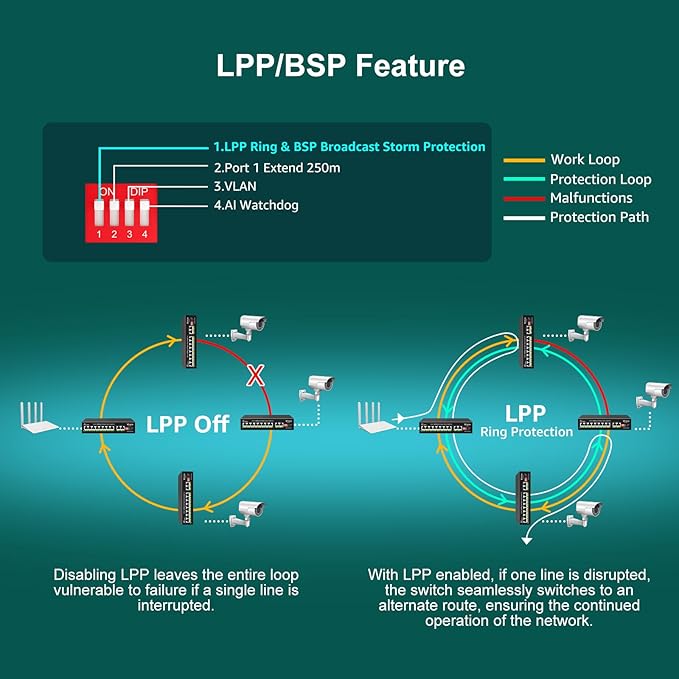 - 🌟AI Watchdog Mode - This enhanced 10-Port 1000Mbps ethernet PoE switch features AI Watchdog Mode. This advanced functionality automatically detects and rectifies port issues, guaranteeing uninterrupted power delivery to all connected devices. Elevate your network's security and reliability with seamless operation, ensuring unparalleled performance for your infrastructure.