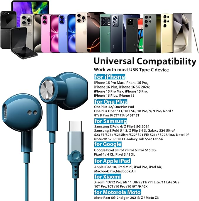- Widely Compatibility: USB C Wired Earbuds compatible with iPhone 17 Pro Max/ 17 Air/ 17 Pro/ 17/, iPhone 16e/ 16 Pro Max/ 16 Plus/ 16 Pro/ 16/ iPhone 15 Series, Samsung A53/ A54/ A55/A35, Galaxy S24 Ultra/S24 FE/ S23/S22/S21/S20, Galaxy Z Flip 6 5 4 3 2/ Z Fold 6 5 4 3 2, Galaxy Tab S9/S9+/S9 Ultra/S8/S7/S6, Google Pixel 8 Pro/ 7 Pro/ 6 Pro/5/4/4XL/3/3 XL,for iPad 10th/Pro/Mini/Air 2024, for MacBook Pro/ Air, for OnePlus 12R/ 12/ Open/ 11/ 10 Pro/ 10t / 9 Pro/ 9/ 8T/8 Pro/7T Pro/7