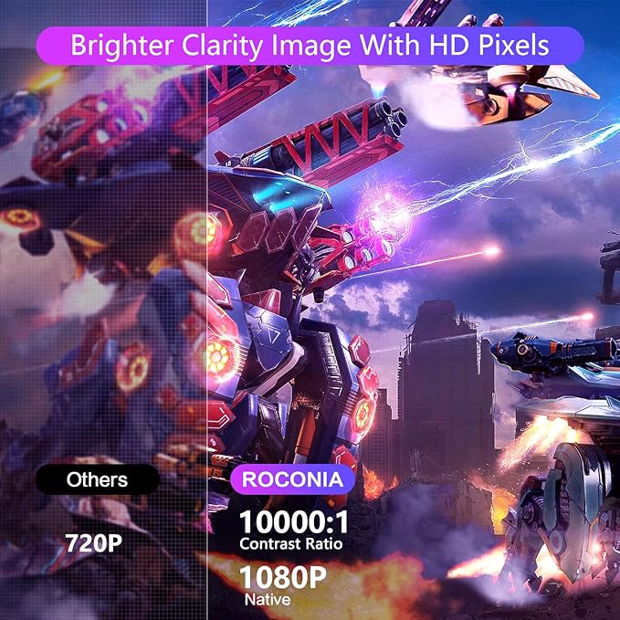 - 【Upgraded Native 1080P 】 Roconia native 1920x1080P resolution, 10,000:1 contrast, high brightness rating of 18,000 lumens, using the latest NTSC color technology, even in bright rooms have very good visual effects. The Roconia projector also uses a high refraction 7-layer glass lens and a diffuse eye protection light source to provide vivid images while ensuring eye protection