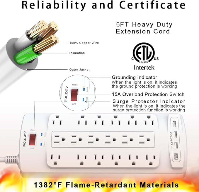 - Safety and Certificate: ETL safety certified, with extension cord and other major components certified by ETL. The over current protection switch limits the power strip's working current to certain setting, so it will not get hot during usage. Environmental protection and fire-resistance PC shell with flame retardant at 1382℉ makes it more durable and longer lifetime.