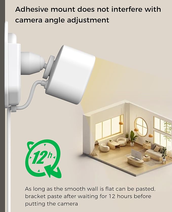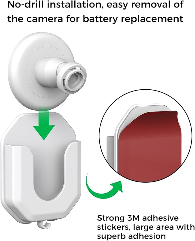 - No Drill No Screws Mount - Simply remove the adhesive tape film from the back of the mount, stick it in the desired location and let it sit for about 12 hours. Then slide the camera into the slot straight down to the bottom.