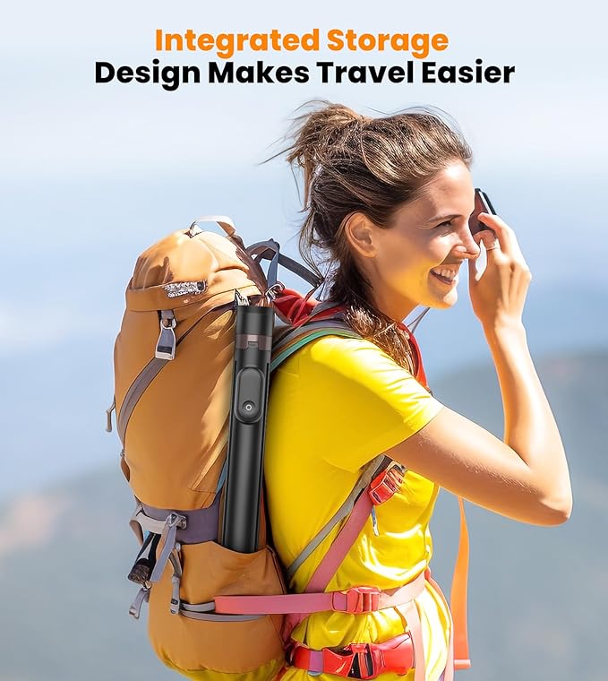 - Larger & More Stable Base : The cell phone tripod base adopts a stable triangular structure, each leg is 28cm/11" long, and the maximum span of the base is 41cm/16.14", which makes the tripod more stable. (Please note that the cellphone tripod should be placed on a flat surface.) The folding design of the selfie stick tripod with remote is very portable, you can put it in your backpack or suitcase and take it with you when you are traveling.