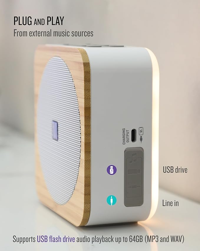 - USER-FRIENDLY DESIGN: Simple controls, volume limiter for different room sizes, 30/60/120-minute sleep timer, and hands-free speakerphone with ENC (Environmental Noise Cancellation) technology for clear phone calls. Rear USB-C port for power input with any PD power adapter, and side USB-C charging port for mobile devices