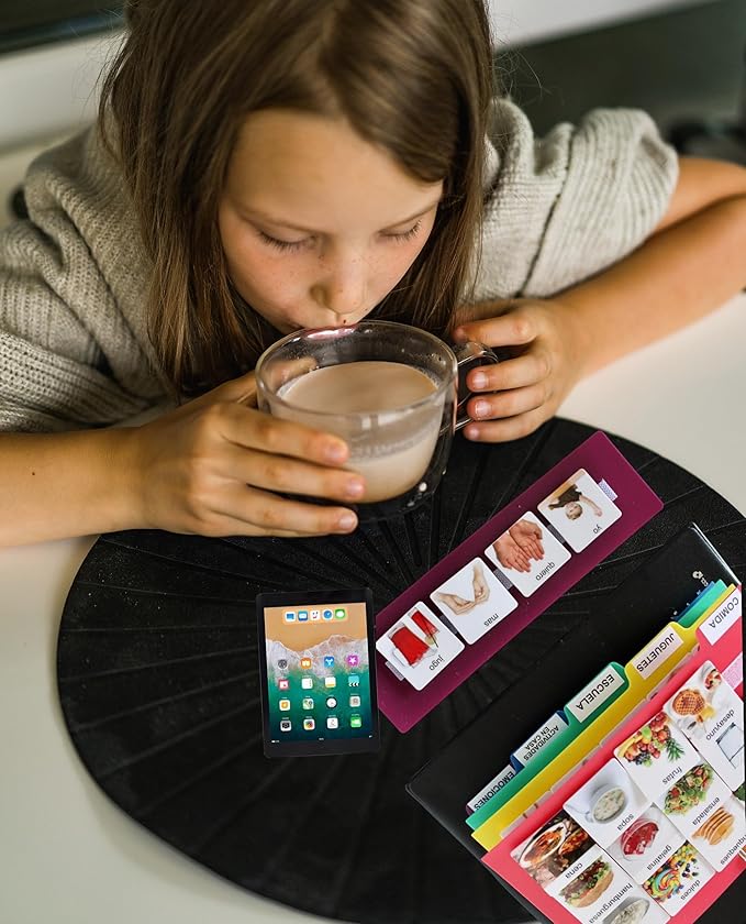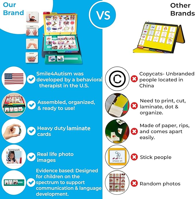 - đEvidence-Based: The communication photo cards aim to equip children on the spectrum with a quick, self-initiating, and functional communication skill. The system starts with the exchange of simple icons and progresses rapidly to building sentence structures, such as "I want apple," "I see park," and "I hear train."