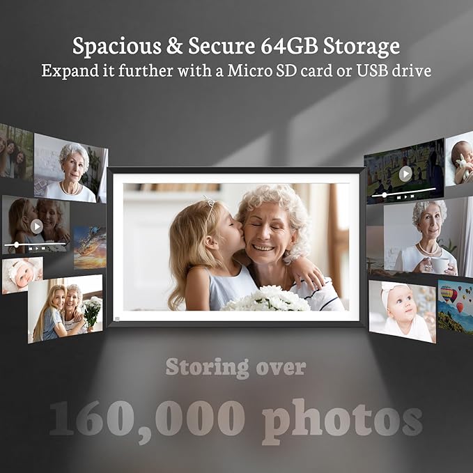- 64GB Large Capacity Storage: The digital picture frames has 64GB memory and supports up to 64GB of external storage. It also supports micro SD cards and USB drive for extended storage if needed. BSIMB electronic picture frame enable multi-user connectivity so that any member of the family can share photos and videos anytime, anywhere. You can share photos and videos over WiFi using the VPhoto app and email from anywhere instantly and securely.