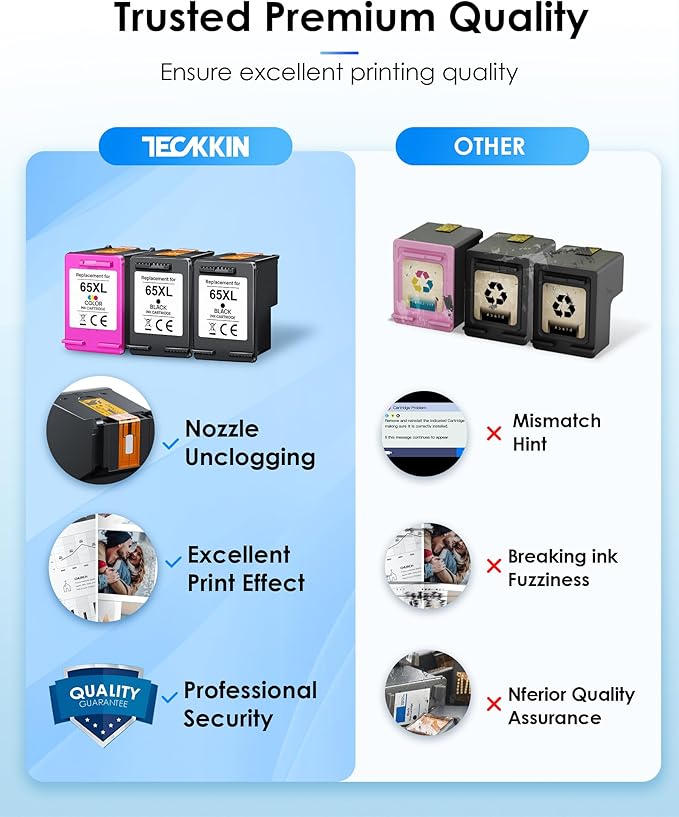 - Reliable Printing Quality: All TECKKIN 4X Capacity 65XL for HP 65 ink are tested to the most rigorous quality, ensure smooth, clean printed text and vibrant color images. We provide 24 months warranty and free replacement of defective ink cartridges and 100% satisfaction guarantee!