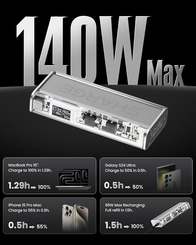 SHARGEEK 140 Power Bank, 20000mAh 140W Portable Charger, Transparent Battery Pack, Smart Display, PD3.0 for MacBook Pro iPhone 17/16/15/14 Series Google Pixel Steam Deck