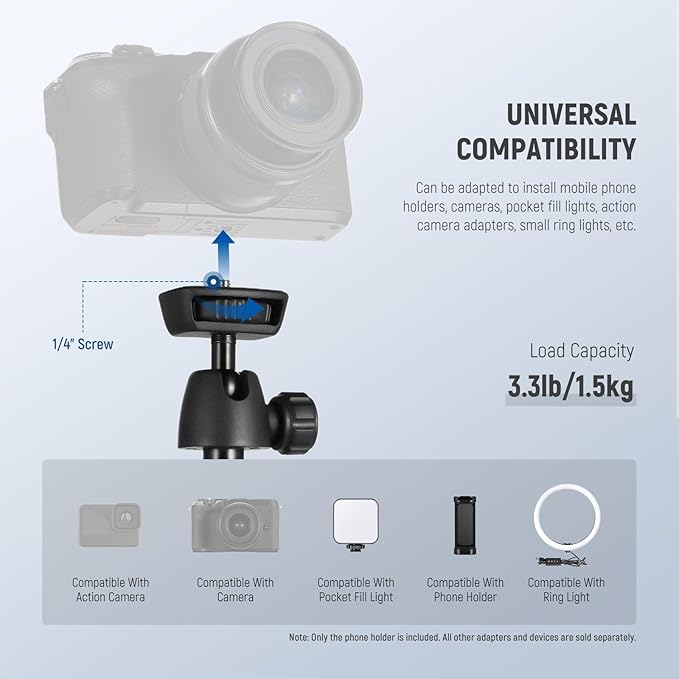 - 【Universal Phone Holder】 This mobile phone tripod stand even includes a phone holder for free hand switches between phones and cameras. The 2.1"~3.4"/5.4~8.5cm adjustable phone holder is compatible with iPhone Samsung Galaxy Note Google Pixel Huawei, and more Android phones, with a hand tightening knob for seamless vertical and horizontal shooting, and one cold shoe to attach LED fill lights, microphones, etc.