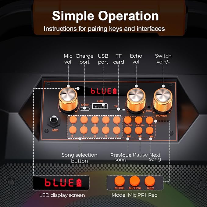 - 【Colorful Disco Lights】Singing machine karaoke features multi-colored LED lights synchronized with the music beat, adding energy to any party. Independent button to adjust the lighting effect or turn it off, five lighting modes ensuring every performance feels like a live stage show. Karaoke machine with 2 microphones is the perfect gift for any holiday. We also provide 12 months warranty and customer service.