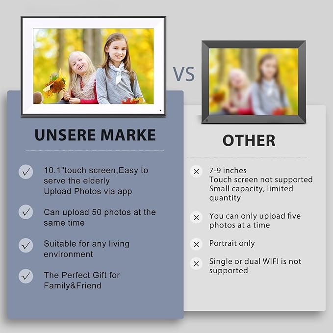 - [Thoughtful Gift, Sincere Help]: This 10.1β Wi-Fi digital photo frame 16GB is the perfect gift for moms, dads, and grandparents who cherish glimpses into the lives of their loved ones. Easily set up slideshows to display your favorite pictures on the digital frame. And if you need any assistance, our dedicated customer service team is here to provide sincere help, advice, and troubleshooting, ensuring a seamless experience for you and your loved ones.